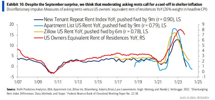 As you can see in the Bank of America chart below, various high-frequency measures of shelter show prices are only up +0.5-2.25% YoY, not +7.2% as reflected in the BLS data.