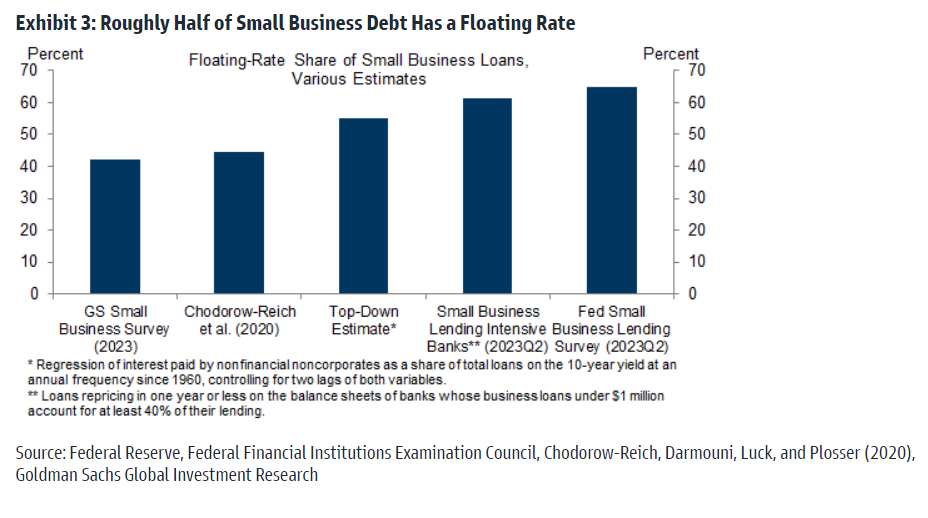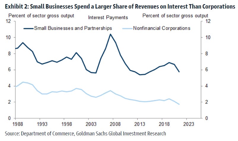 1st, small businesses spend a larger share of revenues on interest payments – Goldman Sachs estimates around 6% for small and 2% for large businesses in 2021.