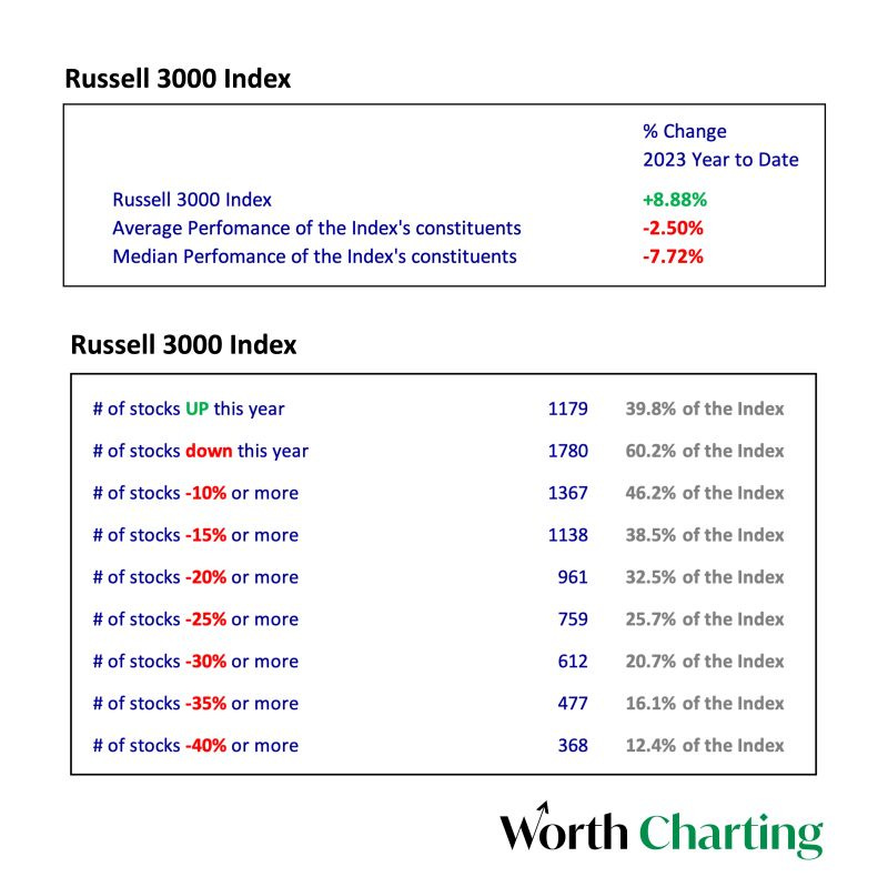 60% of the constituents in the Russell 3000 are down on the year while the median stock is down -7.7%, yet the index is up +8.9% year-to-date.