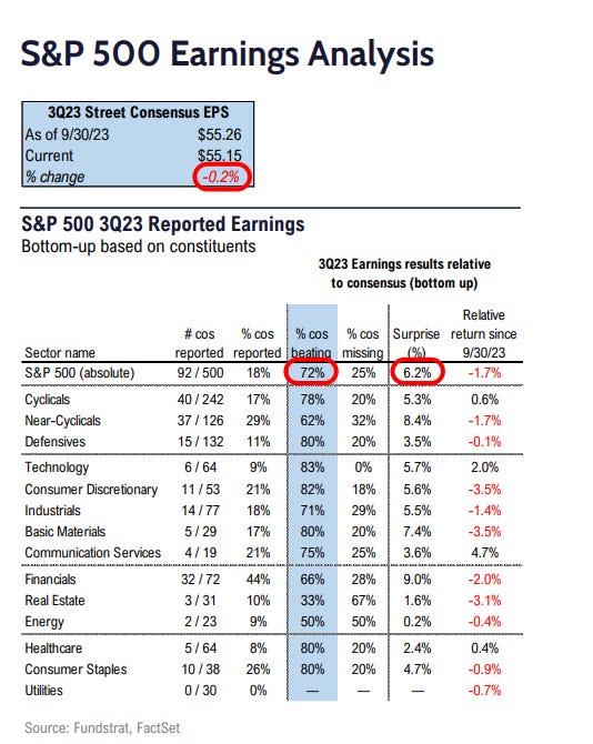 Of the 92 companies (18%) in the S&P 500 that have reported, 72% have reported earnings above their estimates, which is below both the 5-year average of 77% and 10-year average of 73%.