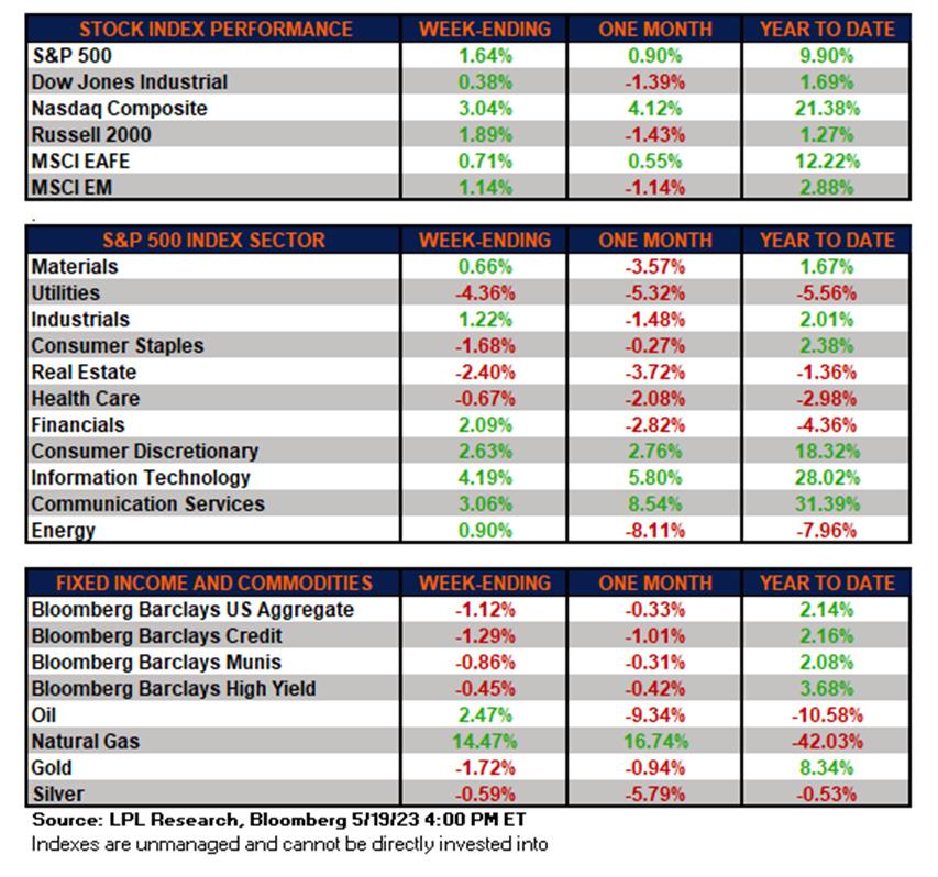 Commodities: Energy prices finished higher this week as global economic sentiment has improved. Natural gas prices have finished higher for the second consecutive week. The major metals (gold, silver, and copper) ended the week lower. The World Gold Council reported this month that global central bank purchases of gold hit a record high in the first quarter of this year, after record annual highs in 2022 amid the present inflation landscape and concerns over a U.S. debt default.