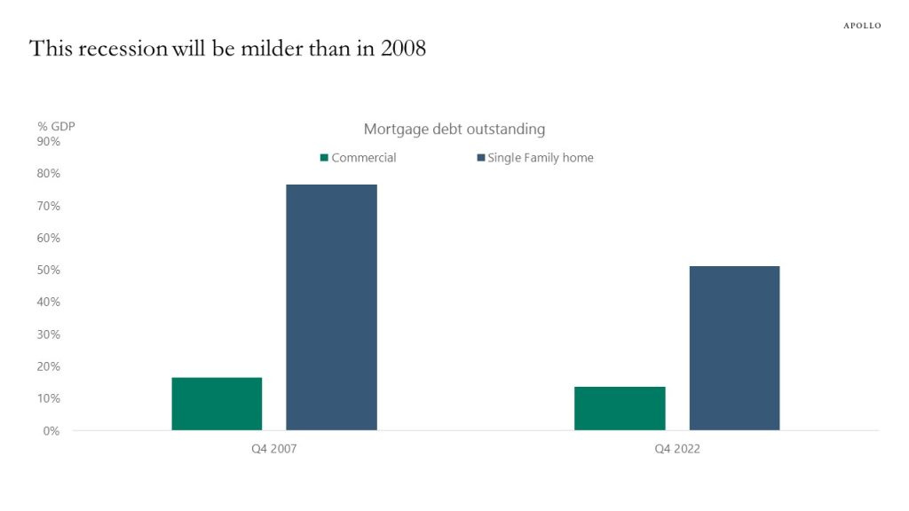 As a result, any recession now will be milder than in 2008, and it will likely be longer because the required correction in CRE prices will be spread out over a longer period.