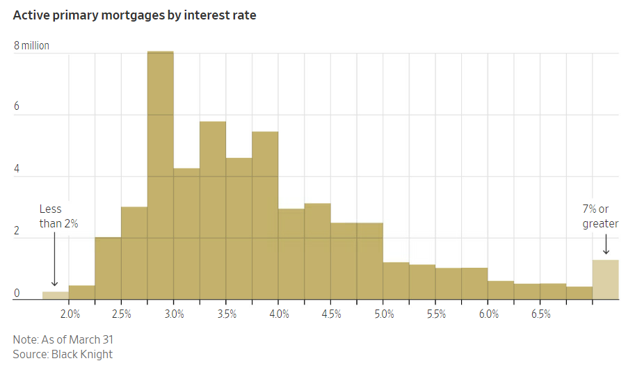 As of March 31st, nearly two-thirds of primary mortgages had an interest rate below 4%, according to a report from mortgage-data firm Black Knight. About 73% of primary mortgages have fixed rates for 30 years.