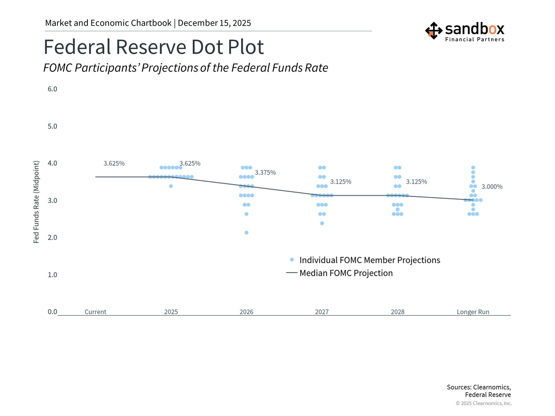 As seen below, the FOMC’s latest Summary of Economic Projections suggest the Fed may cut rates only once in each of 2026 and 2027.