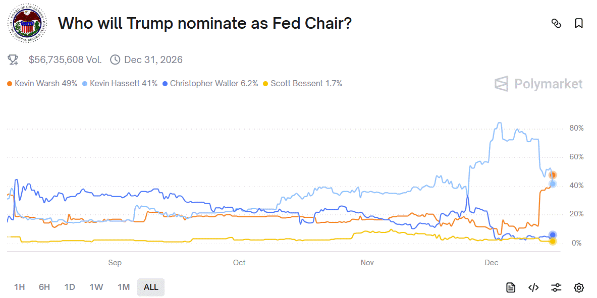 At the moment, the frontrunners include Kevin Warsh, a former Fed governor, and Kevin Hassett, Director of the National Economic Council at the White House. Much could change between now and the final decision, as odds for the frontrunner have shifted in just the past few months.