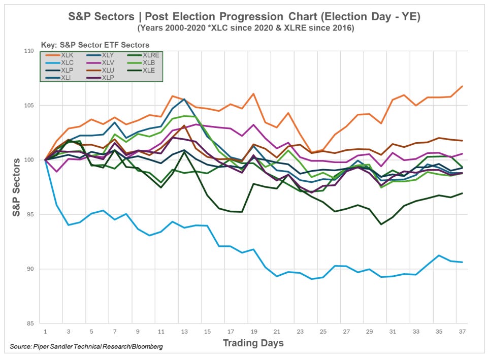 The chart below shows each of the eleven S&P 500 sector ETFs and their post-election 37-day progressions into year-end; data for XLC and XLRE are a bit more limited with more recent origination dates.