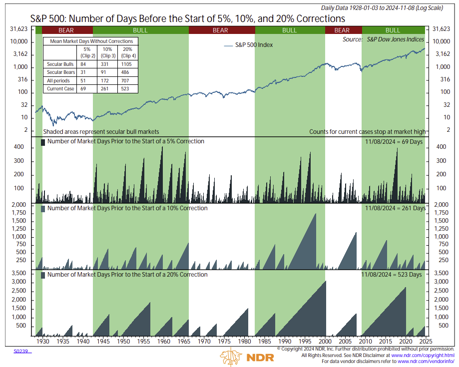 It has been 69 days, 261 days, and 523 days since the S&P 500 last experienced drawdowns of 5%, 10%, and 20%, respectively.