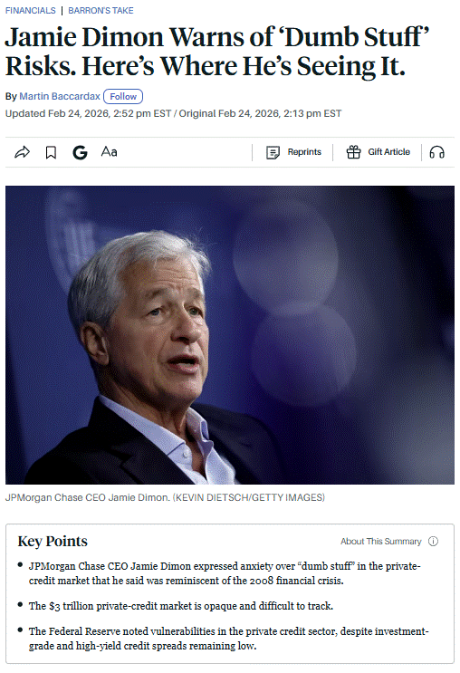 Last week, J.P. Morgan CEO Jamie Dimon piled on by warning of “dumb stuff” in the opaque private credit markets, drawing comparisons with the pre-GFC period.