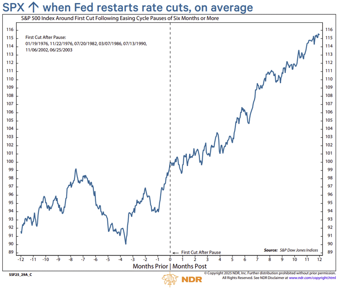 Historically, the S&P 500 has tended to rally in the months before and after it resumes an easing cycle after pausing for six months or more – as is the case today. See the chart below, indexed to the seven most recent historical analogs.