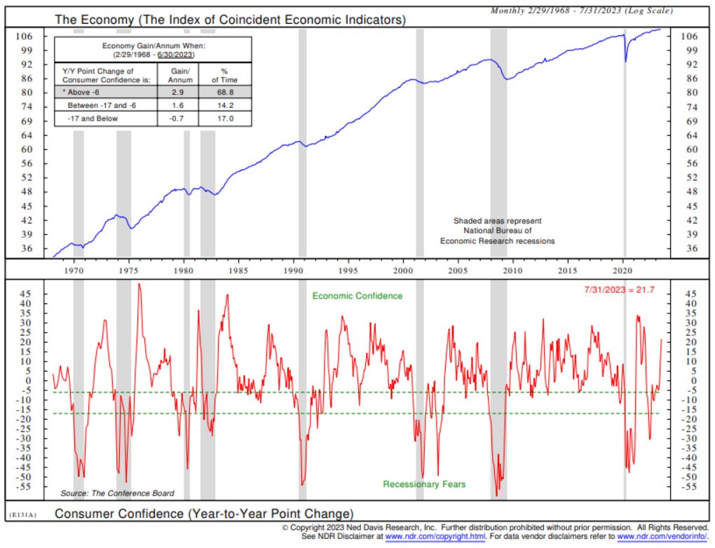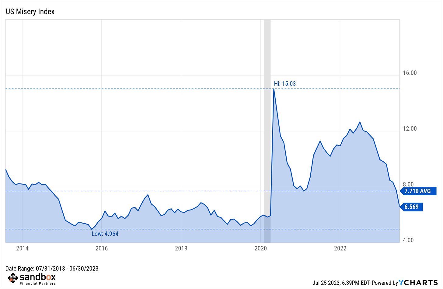 The report attributed the improvement in confidence to "lower inflation and a tight labor market." After all, inflation and unemployment rates comprise the so-called Misery index, which had fallen in June to its lowest level since March 2020. Historically, the Misery index has been negatively correlated with consumer confidence, explaining the rise in optimism in recent months.