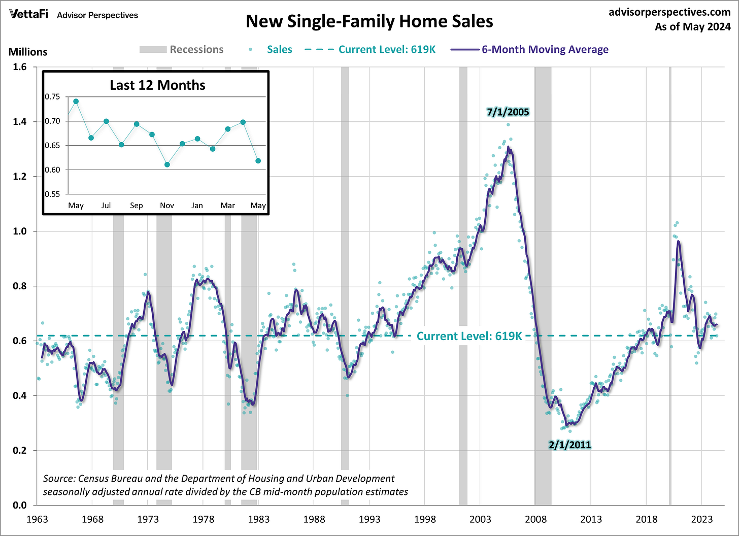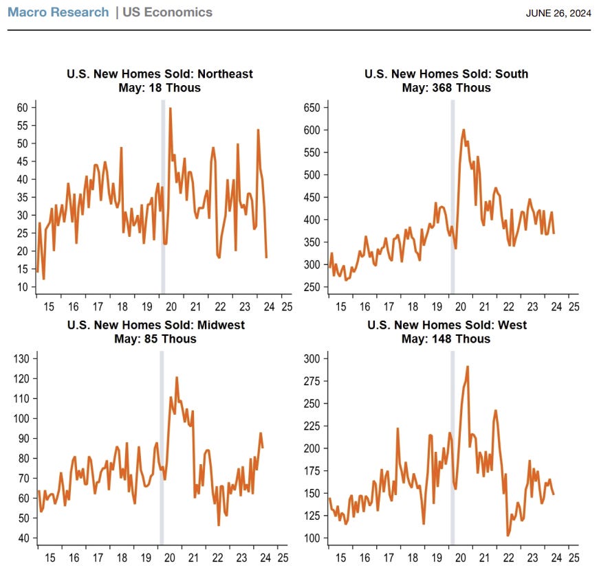 New home sales fell sharply in May by -11.3% to a seasonally-adjusted 619,000 annual rate, the largest decline since September 2022 and represents a 6-month low.
