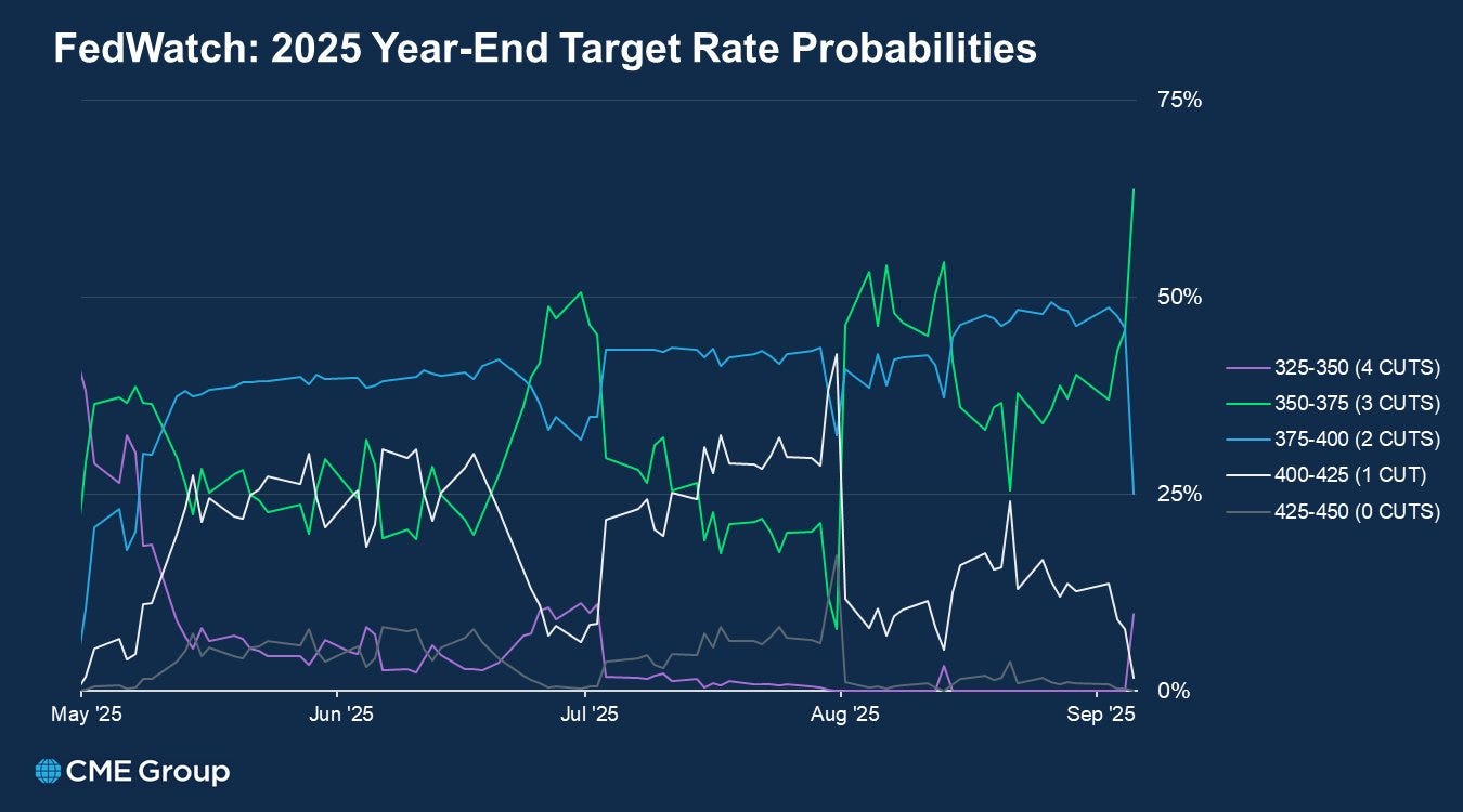 Market-based measures from the CME now show the Federal Reserve to cut rates by 25 basis points at each of its remaining three meetings this year.