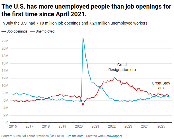 On Wednesday, it was the Job Openings and Labor Turnover Survey (JOLTS). The report showed job openings fell in July to a 10-month low, but more importantly, the U.S. now has more unemployed people than job openings for the first time since the pandemic. Even if employers' hiring plans have been put on ice, layoffs remain low – a hallmark of the current labor market.