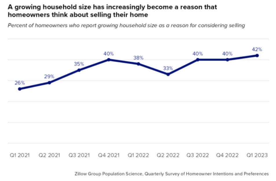 Based on Zillow’s report, 42% of homeowners that are considering selling in the next three years cited growing family size as a reason for moving. This is consistent with the increase seen during the second year of the pandemic when most COVID-19 restrictions began to lift, with the proportion rising from 26% to 40% between March and December 2021.