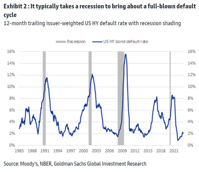 Second, history suggests it typically requires an outright recession to push the High Yield bond and leveraged loan markets into a full-blown default cycle (i.e. double-digit default rates). The next chart shows that apart from the 2016 default cycle that was concentrated almost exclusively among Oil & Gas and Commodities issuers, every other significant period of defaults was presaged by a recession.