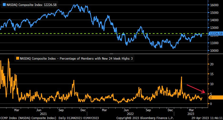 The Nasdaq Composite continues to be the leader of the major U.S. stock indices in 2023 – climbing to its highest level since September 2022 and returning +15% YTD – yet only 3% of index constituents have made new 6-month highs.