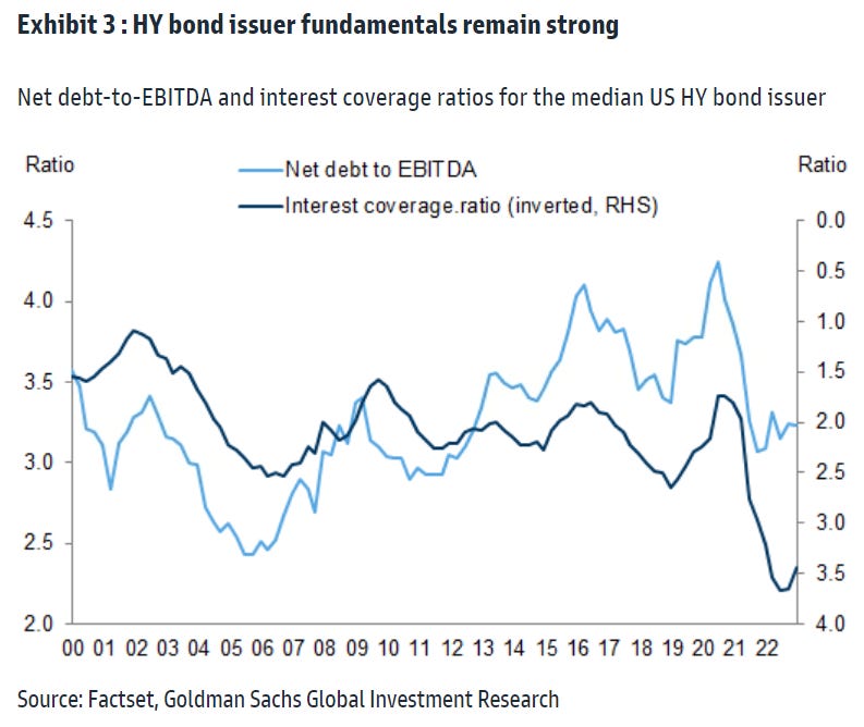Third, if a recession does materialize, High Yield issuers are currently in a position of strength from a fundamental standpoint, which would allow them to weather the storm better than in previous cycles. Interest coverage ratios, or a company’s earnings as a function of its debt interest expenses, are hovering at healthy levels, while net leverage remains the near the lows of the post-GFC era.
