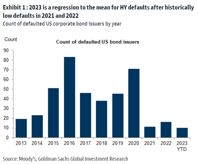 First, while defaults have undoubtedly picked up this year, the recent uptick is a return to normalcy rather than the start of a full-blown default cycle. 2021 and 2022 saw defaults materialize at exceptionally low levels, with only 11 and 16 defaulted bond issuers, while 2015-2020 averaged 56 defaulted bond issuers per year.