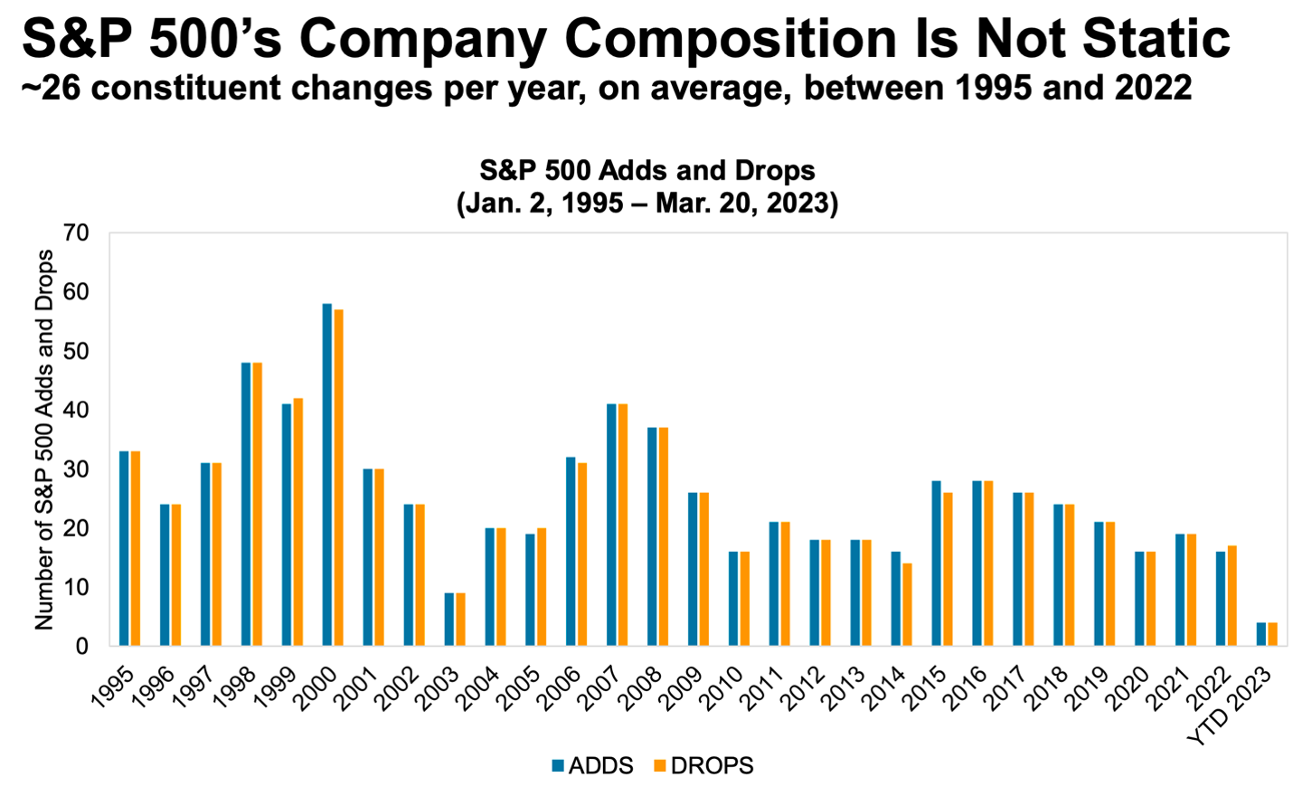 And yet, buying the S&P 500 index does not mean we are purchasing a static basket of 500 stocks. In fact, it’s quite the contrary. See below.