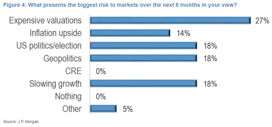 Last week, J.P. Morgan’s poll of its institutional clients showed that elevated valuations are the biggest perceived risk to markets over the next 6 months.