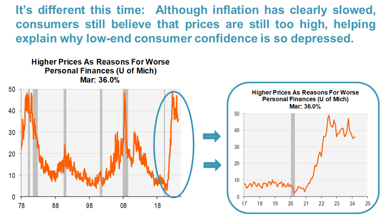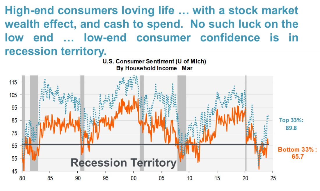 And yet, low-end consumers confront a different reality, explaining their recession-like sentiment.