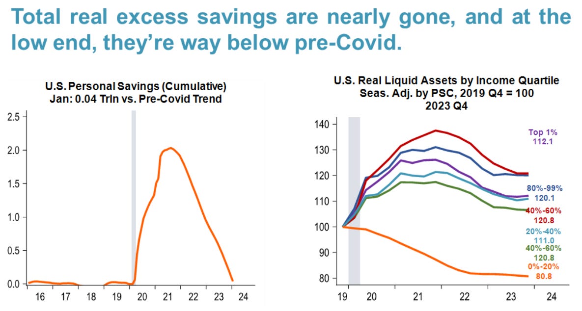 For the top tier, Fed rate cut talk is powering stocks higher, and in turn, high-end consumer confidence and spending. In addition, high-end consumers still have excess savings, supporting consumer spending. House prices are still near record highs, another wealth effect multiplier that supports spending.