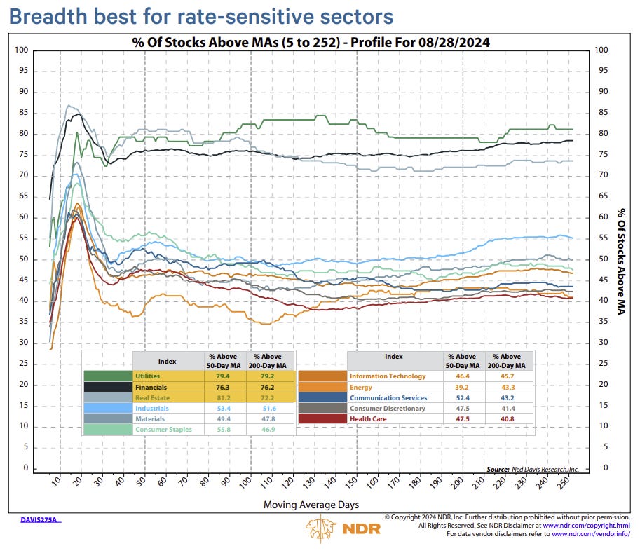 Rate-sensitive sectors (both positive and negative) have seen remarkably strong breadth, with readings from Utilities, Financials, and Real Estate head and shoulders above all other sectors.