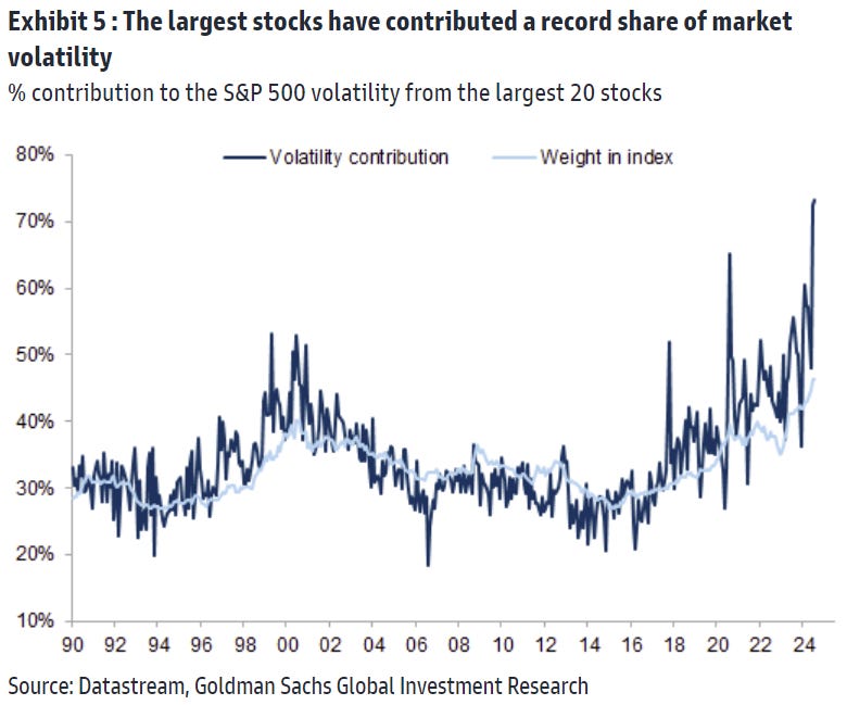 That being said, today the largest stocks in the S&P 500 not only make up a record share of its market cap, but they also drive a record share of its volatility.