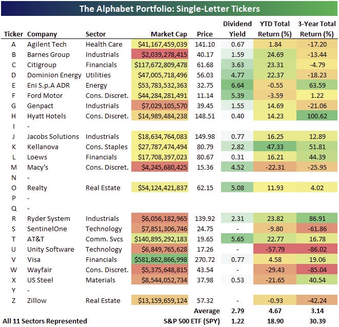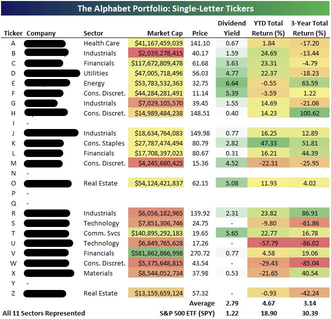 Yesterday, we posed the following trivia question: how many companies can you name in the 1-letter ticker universe?