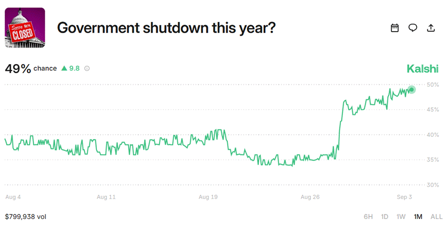 Per the betting market Kalshi, the current odds of a shutdown are roughly 50-50, although the probability has increased recently as the deadline comes to the forefront.