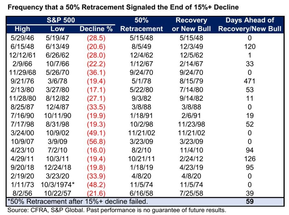 The S&P 500 is currently returning -10.41% year-to-date. The index bottomed on June 16th closing down -23.07%, meaning we have now recovered over 50% of the 2022 losses – a important technical development (50%) that market technicians view as constructive when viewing market direction and sentiment. Of the 19 past occurrences in the post- World War II era that the S&P 500 entered a bear market, the 50% retracement test signaled the end of the market’s decline all but one time. Another feather in the bull’s cap…