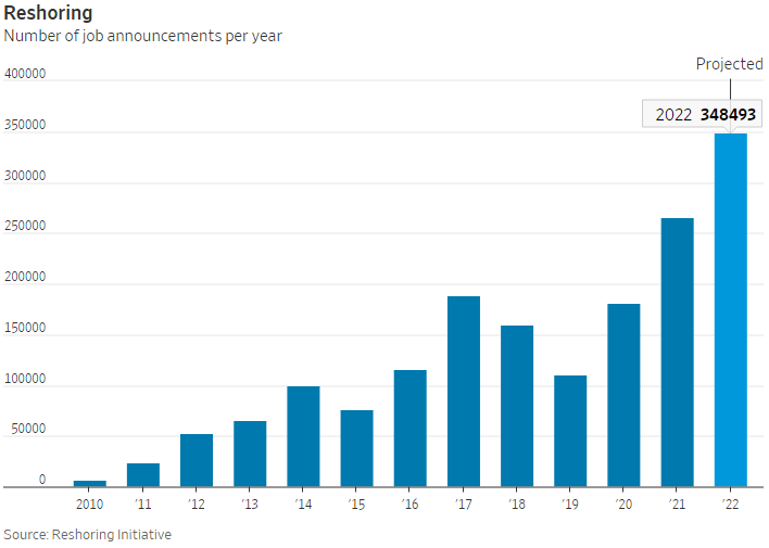American companies are on pace to reshore, or return to the United States, nearly 350,000 jobs this year, according to a report published Friday by the Reshoring Initiative. That would be the highest number on record since the group began tracking the data in 2010. The Reshoring Initiative lobbies for bringing manufacturing jobs back to the U.S.
