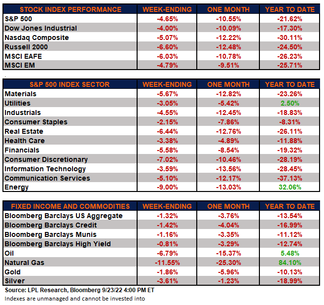Stocks: Markets worldwide were down sharply this week with the S&P 500 Index finishing over 3% lower for the fourth week in the past five. Investors are worried that given Q3 earnings warnings and other signs of a slowing economy, the Federal Reserve (Fed) will steer the economy into a “hard landing” as they attempt to curb present price pressures.