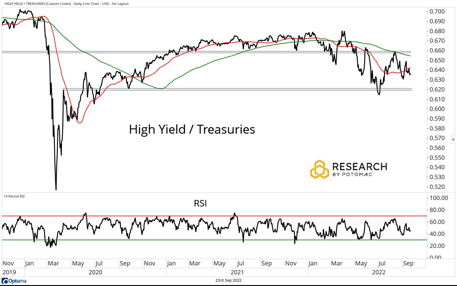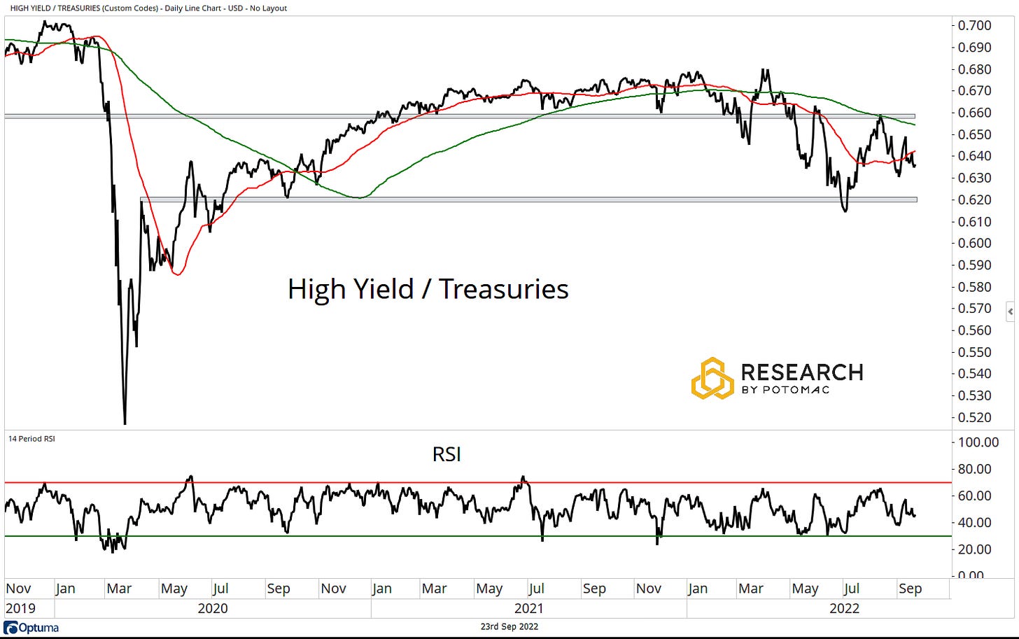 The High Yield/Treasury ratio remains stuck between support and resistance, yet is also below the 50 DMA and 200 DMA. The declining downtrend here remains neutral.
