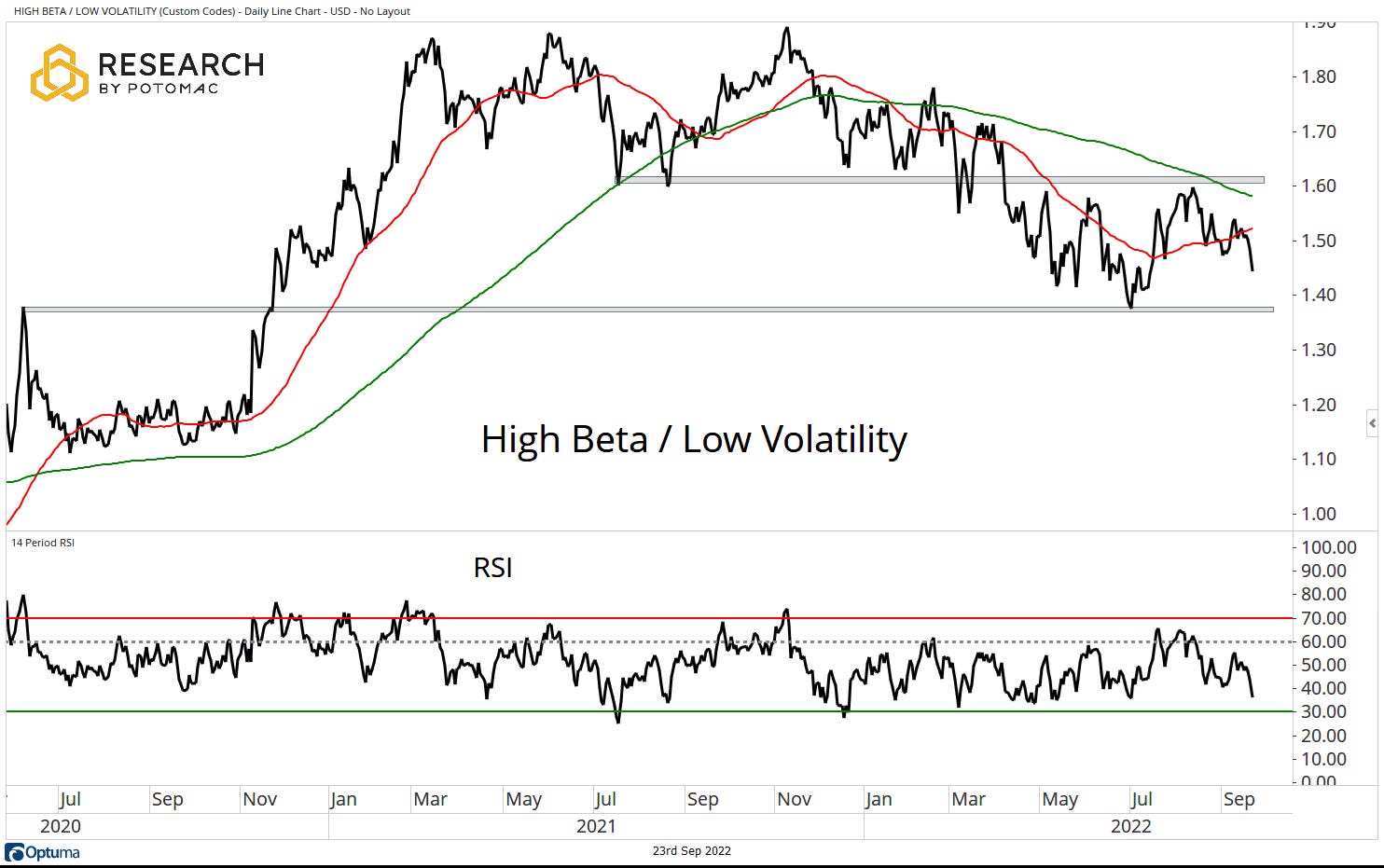 The High Beta/Low Volatility ratio has fallen below the 50 DMA and firmly remains under the declining 200 DMA as it now trades in a consolidation zone. A break of support could signal the next stage of risk aversion in the market.