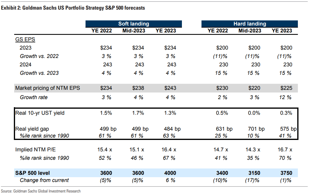 Per the report from David Kostin’s team at GS, the outlook is unusually murky. The forward paths of inflation, economic growth, interest rates, earnings, and valuations are all in flux more than usual with a wide distribution of potential outcomes. Furthermore, investor focus will soon turn from valuation to earnings in the near term; the pressing risk for stock investors is 3Q22 earnings season where record high profit margins will be under intense scrutiny. For context, Goldman estimates that in a recession falling S&P 500 earnings-per-share (EPS) could cause the S&P 500 index to decline to 3150 – maintaining 3% EPS growth but a lower P/E multiple of 15x (vs. 18x) – resulting in the so-called “hard landing” scenario.