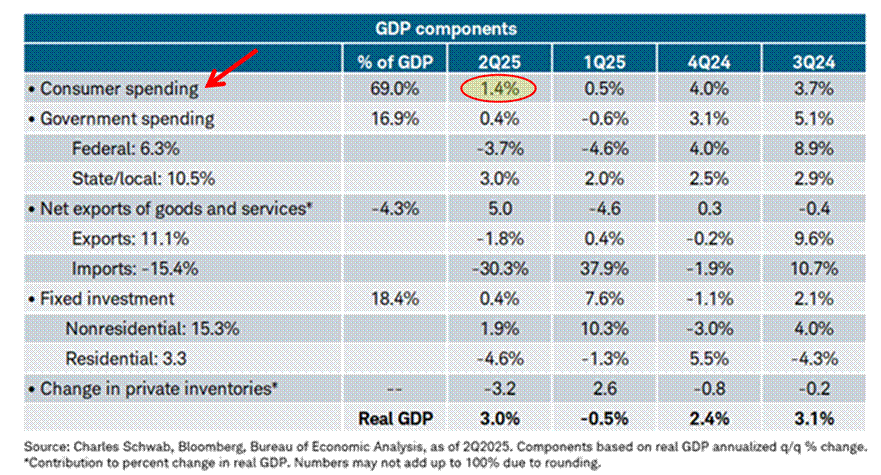 Consumer spending, the main engine of the U.S. economy, rose at a +1.4% annualized rate in Q2, following a +0.5% gain in the previous quarter.
