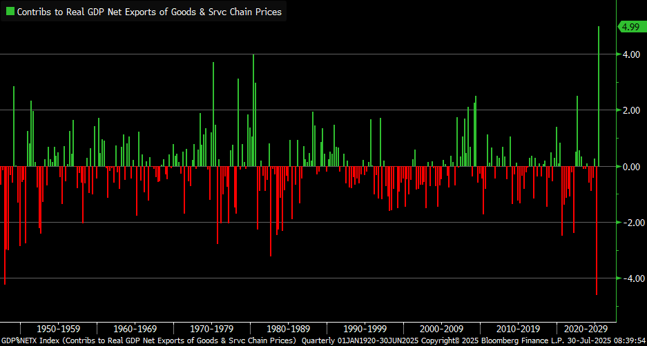 As a result, Net Exports (Exports minus Imports) subtracted 4.61 percentage points from real GDP growth in Q1, which was more than made up by a 4.99 percentage points positive contribution to growth in Q2.