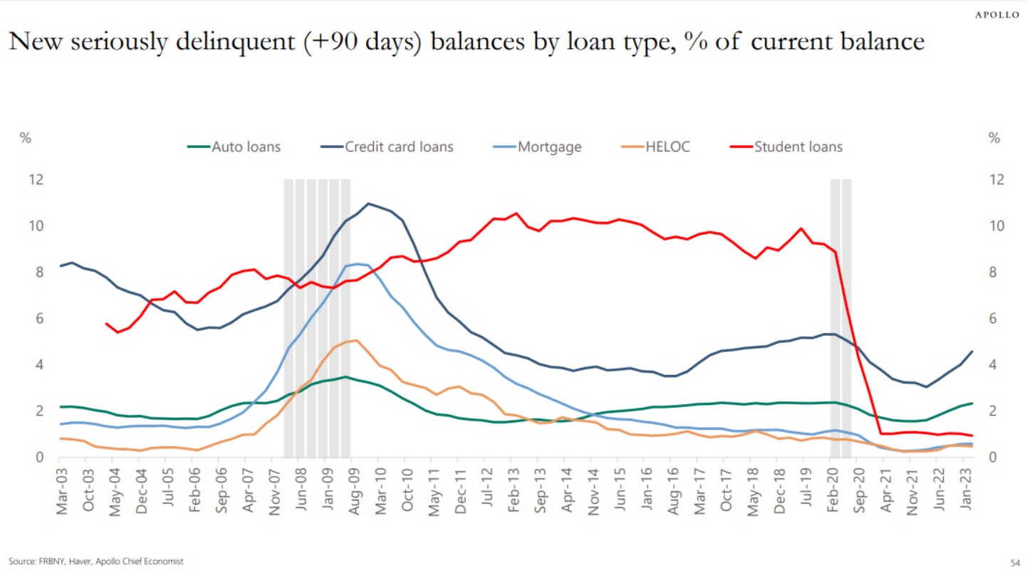 The other story, when looking at a broad range of indicators – rising delinquency rates for credit cards and auto loans (see chart below), rising default rates for HY and loans, rising corporate bankruptcies, slowing loan growth for banks), says the lagged effects of Fed hikes are finally creating fractures in credit.