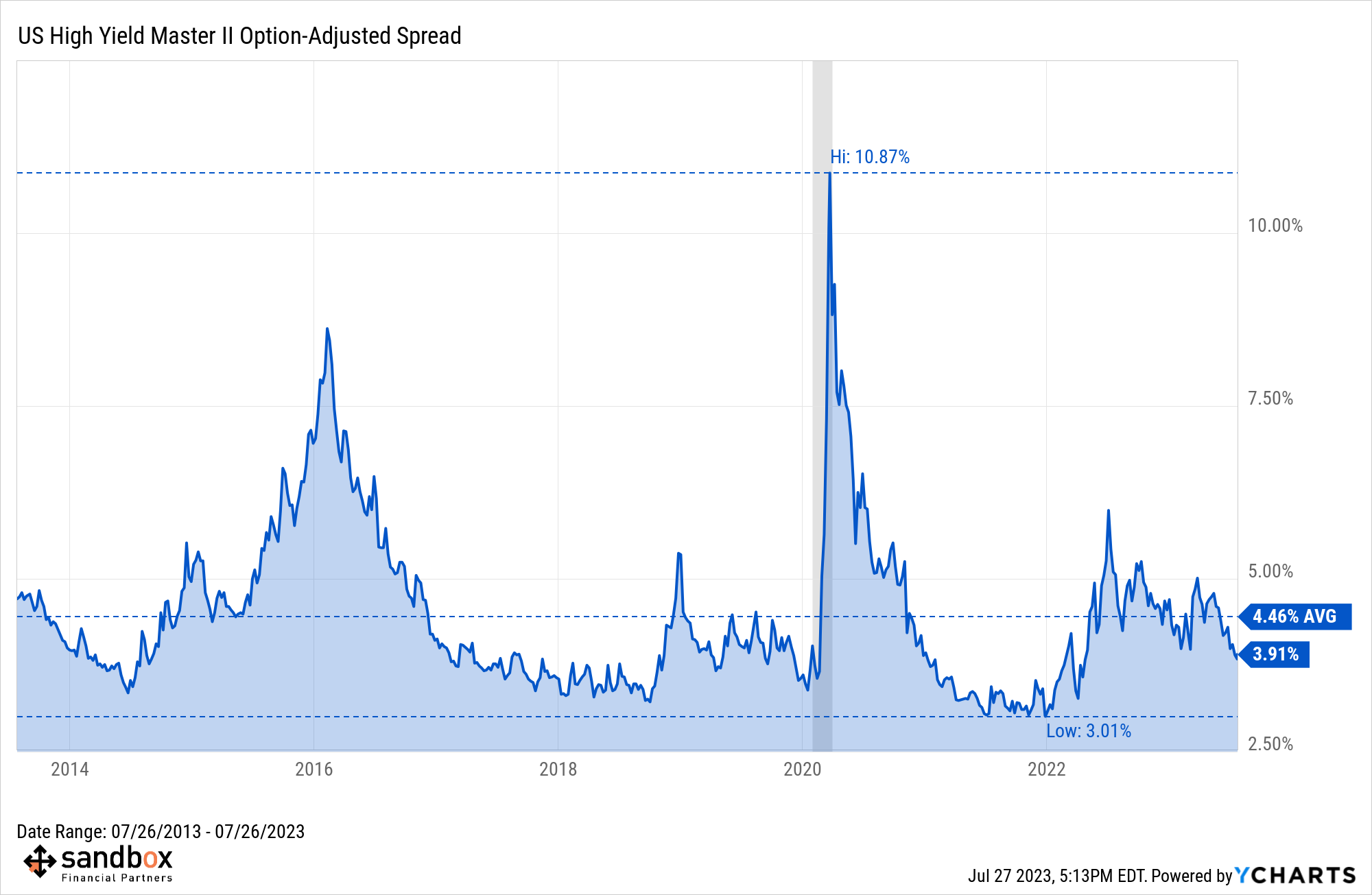 One story on credit says credit spreads (3.9%) on U.S. high-yield bonds are the lowest since April 2022 and well below the 10-year average of 4.5%.