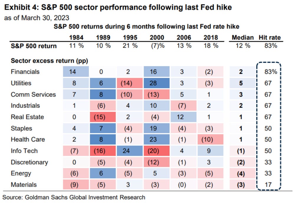 At the sector level, returns at the end of hiking cycles have been inconsistent. No sector out- or under-performed in every episode. Financials have outperformed the S&P 500 most consistently, leading the market in 5 of 6 cycles; Materials posted the worst hit rate (17%).