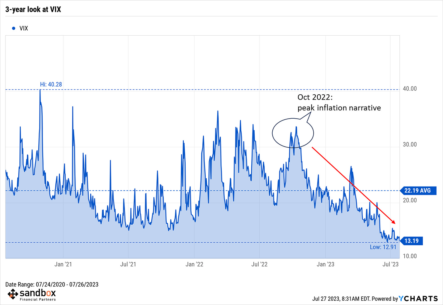 The inflation narrative dominated headlines in 2022, peaking sometime around October. And when inflation “hit a wall” in October, so did equity volatility. This is around the same time when the U.S. dollar peaked and interest rates stopped backing up.
