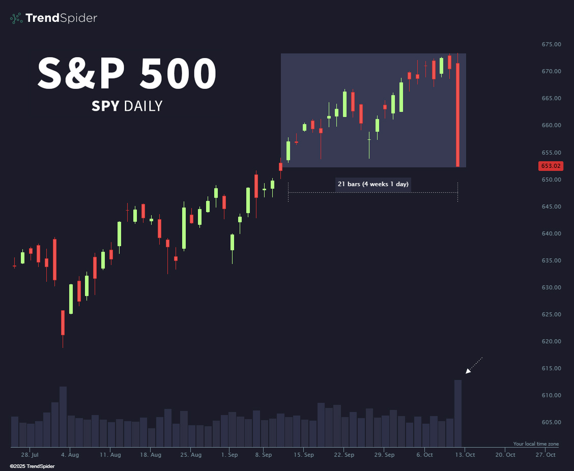 Stocks paid the price as the S&P 500 index dropped 2.7%, with Friday’s red candle engulfing the prior twenty trading days in just one session. See the chart below.