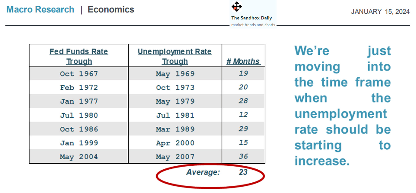 In fact, February 2024 will mark the beginning of the time frame when joblessness “should” start climbing – 23 months after the lows in the Fed Funds Rate in March 2022.