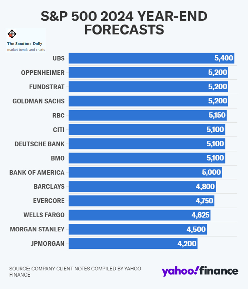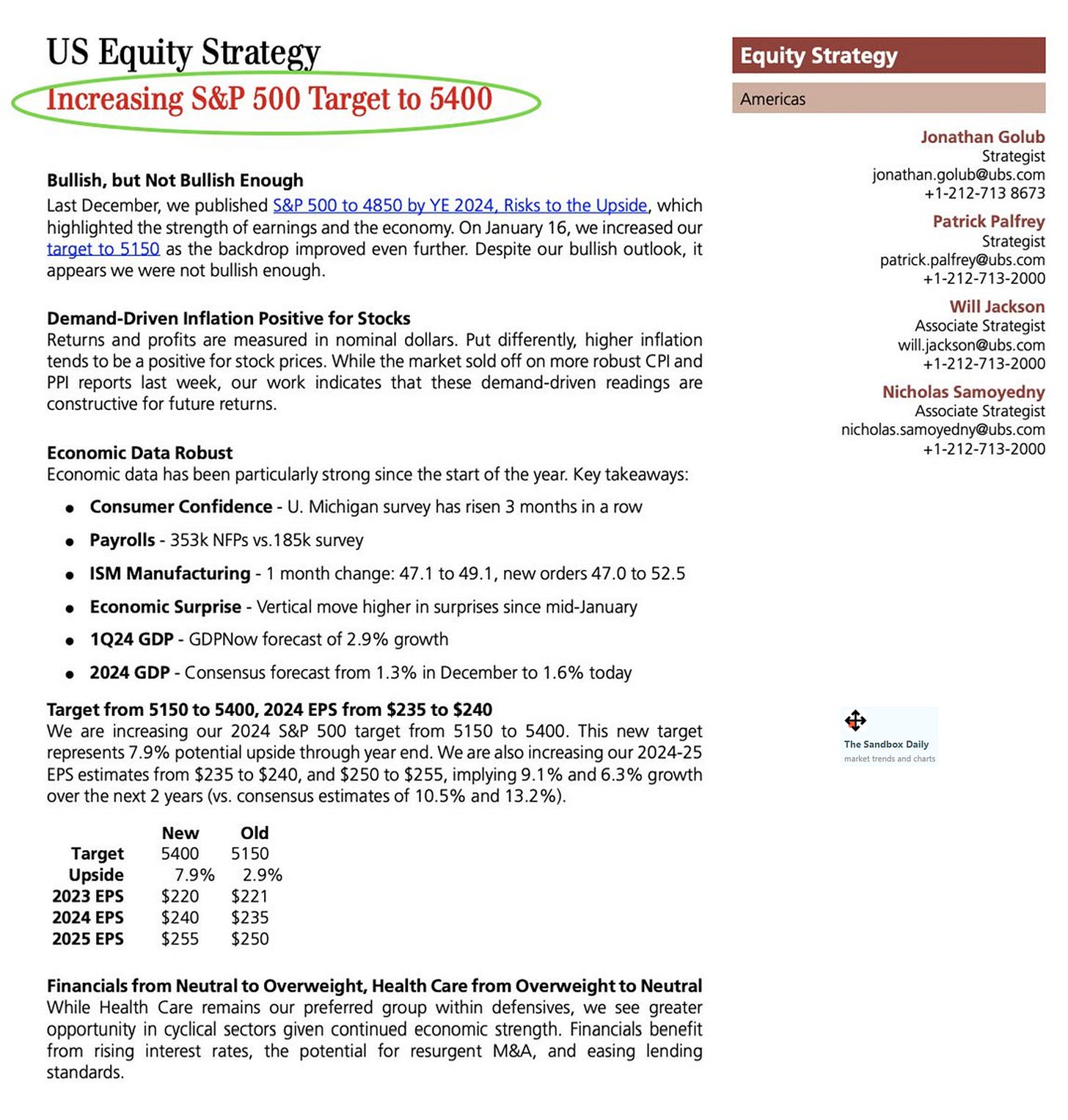 UBS strategists raised their 2024 Price Target for the S&P 500 again, saying their last hike – only 4 short weeks ago – was not bullish enough. Earlier this week, UBS lifted their year-end guide for the S&P 500 to 5400, implying roughly 6% upside from current levels.