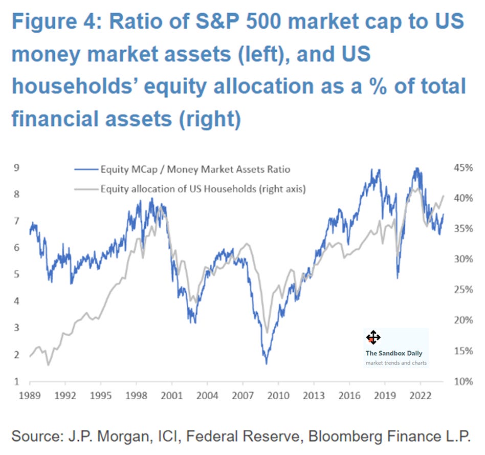 However, as J.P Morgan notes, the asset base of money market funds is historically low relative to the size of the equity market (equity market cap / money market assets ratio is 80th percentile relative to the past 35 years of history), implied investor cash allocations are below average, and US households’ equity allocations are near record highs.