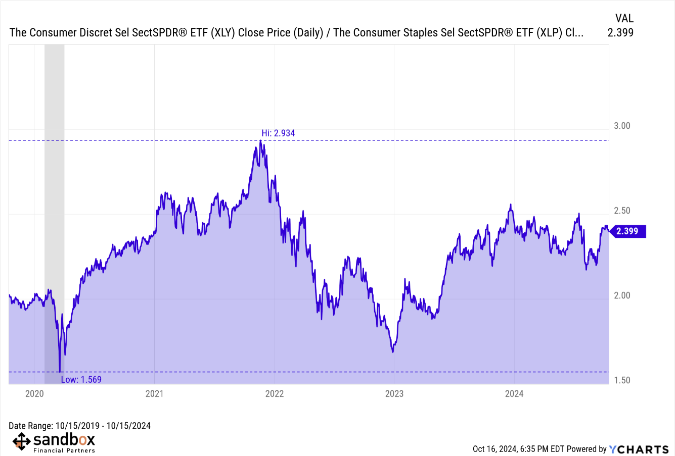 One of our favorite intermarket indicators to gauge risk appetite is the ratio of Consumer Discretionary (XLY) stocks to their Consumer Staples (XLP) counterparts.