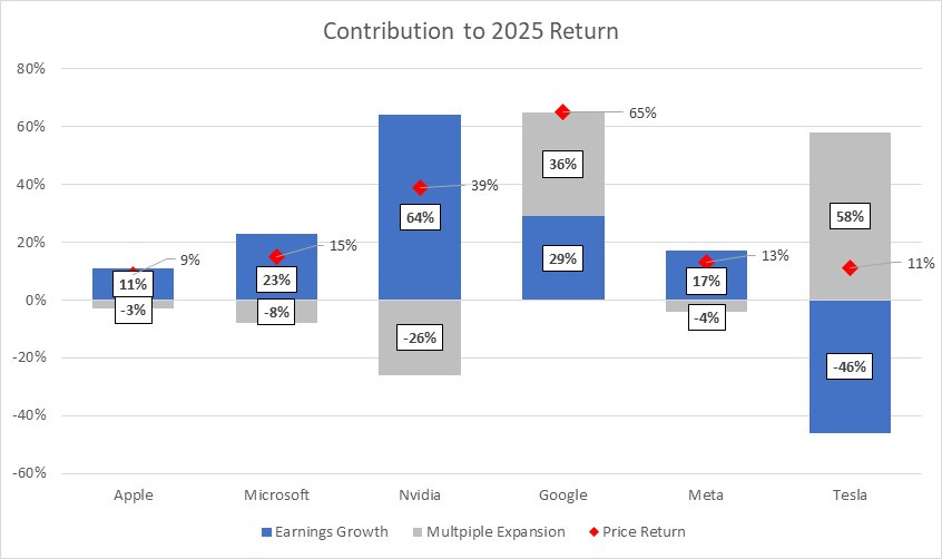 The chart below deconstructs the 2025 returns for the “Mag 6” (Nvidia breaks every model, so we’ll set it aside).