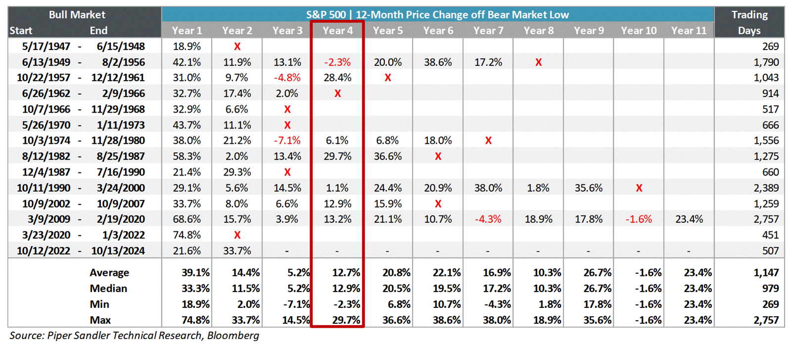 Since World War II, six of the last seven bull markets that reached their fourth year were higher a year later – for an average return of +12.7% and a median return of +12.9%.