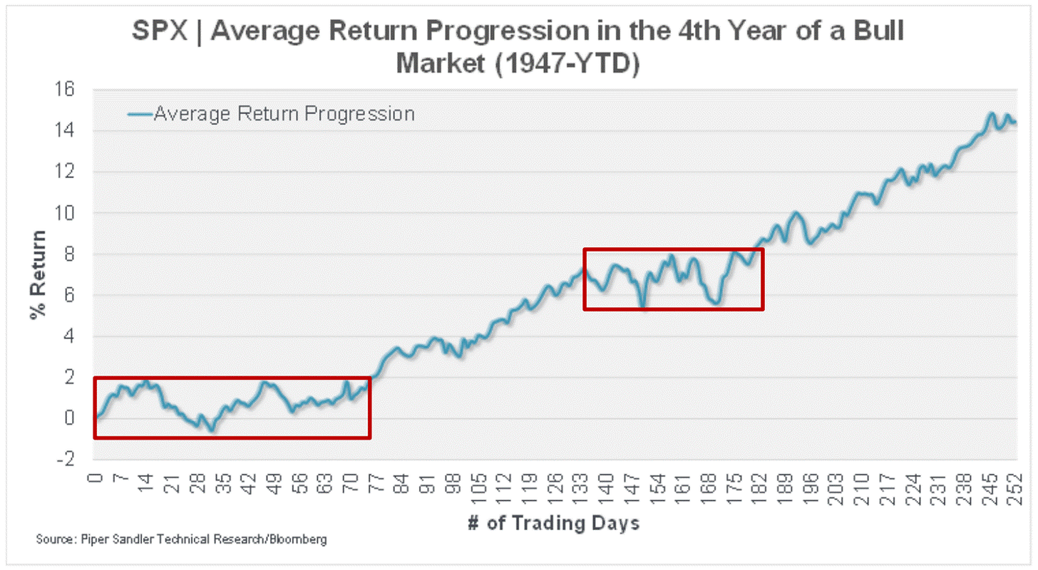 When reviewing the average progression of the fourth year of bull markets, they often undergo a consolidation phase during their first ~75 days before pushing higher.
